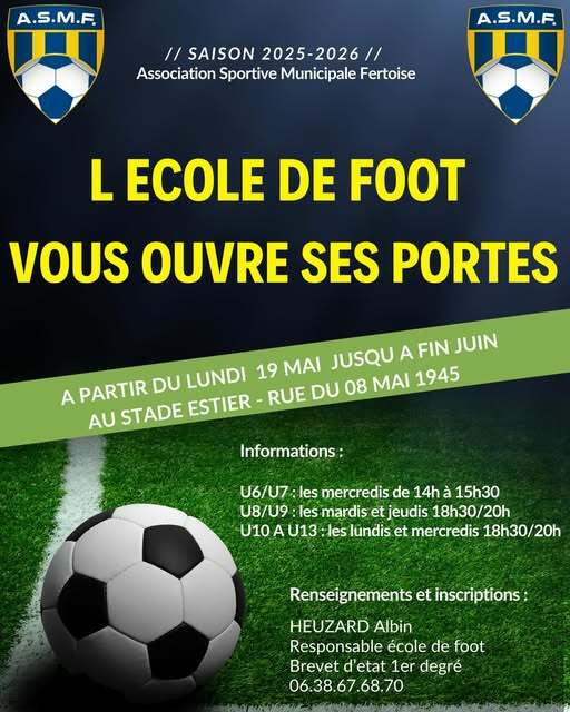 Dans le cadre de son développement de l école de foot le club de football de l ASMF (Ferte Sous Jouarre) a le plaisir de vous ouvrir ses portes à compter du lundi 19 mai 2025.