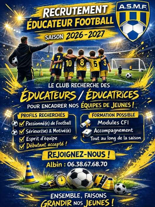 Dans le cadre son projet club et le développement de la structure sportive, l ASMF recherche des éducateurs et dirigeants afin de renforcer son équipe pédagogique sur les catégories foot animation et foot à 11.